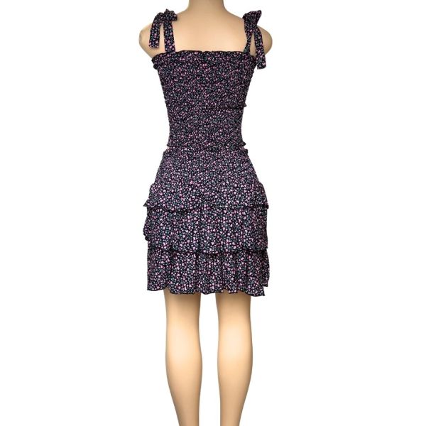 Kjolen har samma smock över höften och avslutas med tre volanger för en lekfull och luftig